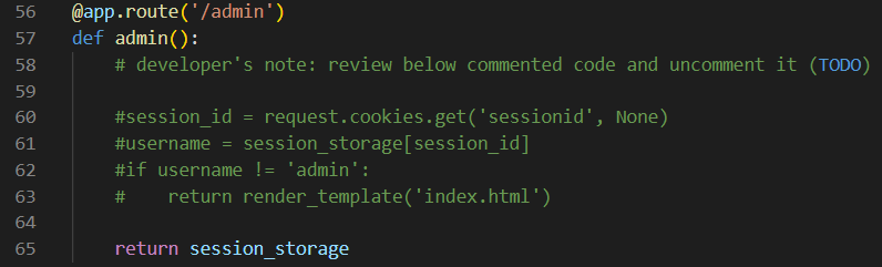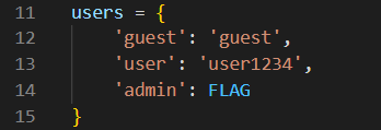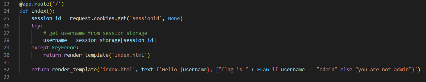 '/'페이지에 대한 코드다. 해석해보면 세션 아이디를 가져와서 딕셔너리에 검색한다. 이를 username변수에 대입 후 admin이면 flag를 내보내주는 방식이다.