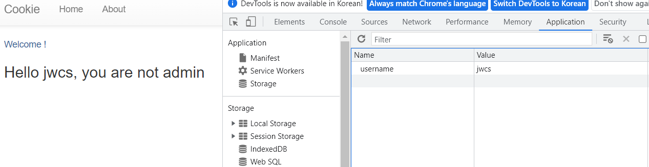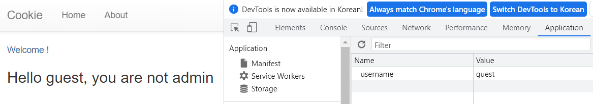 guest로 접속한 모습이다. 쿠키가 생성된 것을 알 수 있다.