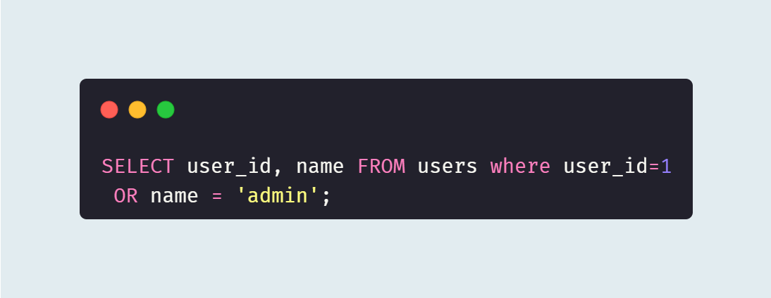 `OR`를 통해 `user_id`가 1이거나 `name`이 `admin`인 레코드를 조회한다