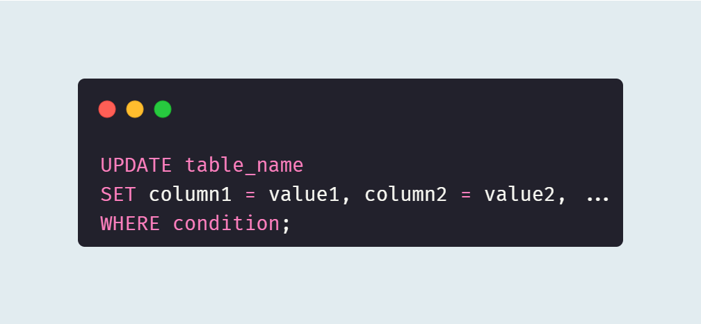 `SET column1 = value1, column2 = value2 ...`는 업데이트할 열과 그에 해당하는 새로운 값이다. 하나 이상의 열을 업데이트할 수 있다.