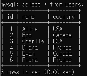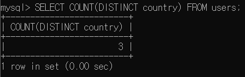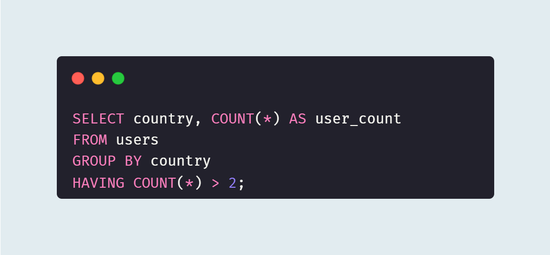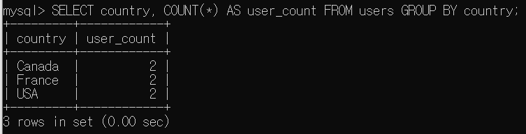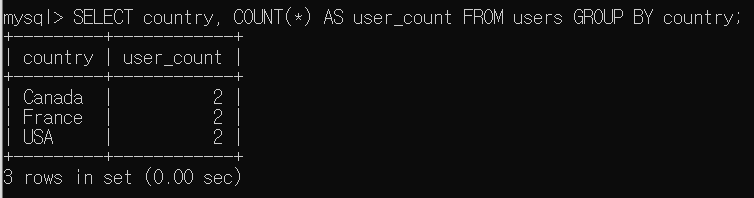 이 쿼리는 country로 그룹화하여 각 국가별 사용자 수를 계산한다. 그리고 `HAVING` 절을 사용하여 그룹화된 결과 중 사용자 수가 2명 초과인 국가만을 결과로 필터링한다.
