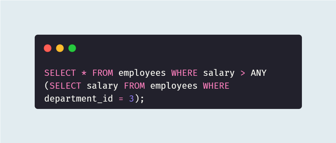 `ANY` 키워드는 적어도 하나가 주어진 비교 조건을 만족할 경우 참을 반환한다. 위 예시에서는 `department_id`가 3인 직원들의 급여보다 더 많은 급여를 받는 모든 직원을 조회하는 예시다.