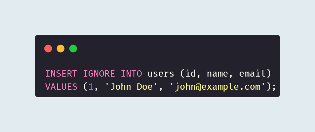 - INSERT IGNORE INTO: 새로운 레코드를 삽입할 때 기존의 중복 키와 충돌이 발생하는 경우, 해당 삽입 작업을 무시하고 오류를 발생시키지 않는다. 대신, 삽입을 시도한 레코드는 무시되고, 프로그램은 다음 작업을 계속 진행한다.