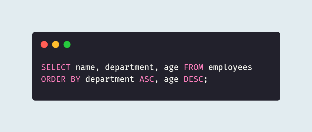 `ORDER BY`를 통해 정렬을 정할 수 있다. 위 커리는 `department` 열에 따라 오름차순으로 결과를 정렬한 다음, 동일한 `department` 값을 가진 행들을 `age` 열의 값에 다라 내림차순으로 다시 정렬한다.