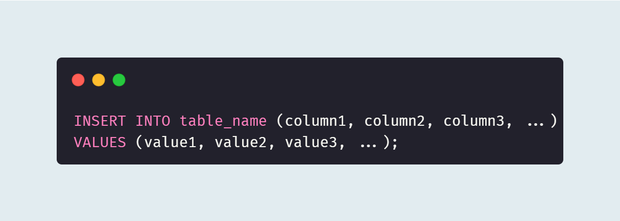 `VALUES (value1, value2, value3, ...)`은 각 열에 삽입할 데이터 값이다. 열의 순서와 데이터 값의 순서는 일치해야 한다.