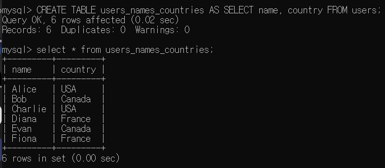 위 예시는 `name`과 `country` 열만을 포함하는 `users_names_countries` 테이블을 생성하는 예시다.