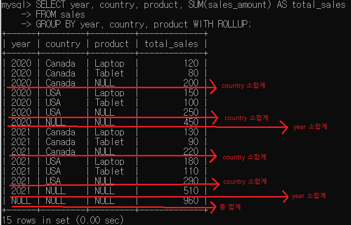 위와 같이 소합계와 총합계를 구할 수 있다. `ROLLUP`을 사용하여 각 제품별 판매량, 각 국가별 모든 제품의 총 판매량, 각 국가별 모든 제품의 총 판매량, 각 연도별 모든 국가와 제품의 총 판매량, 전체 기간 동안 모든 국가와 제품의 총 판매량을 구할 수 있다.