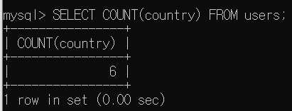 count 함수 사용 예시다. 위 쿼리는 각 country의 user 수를 세는 예시다.