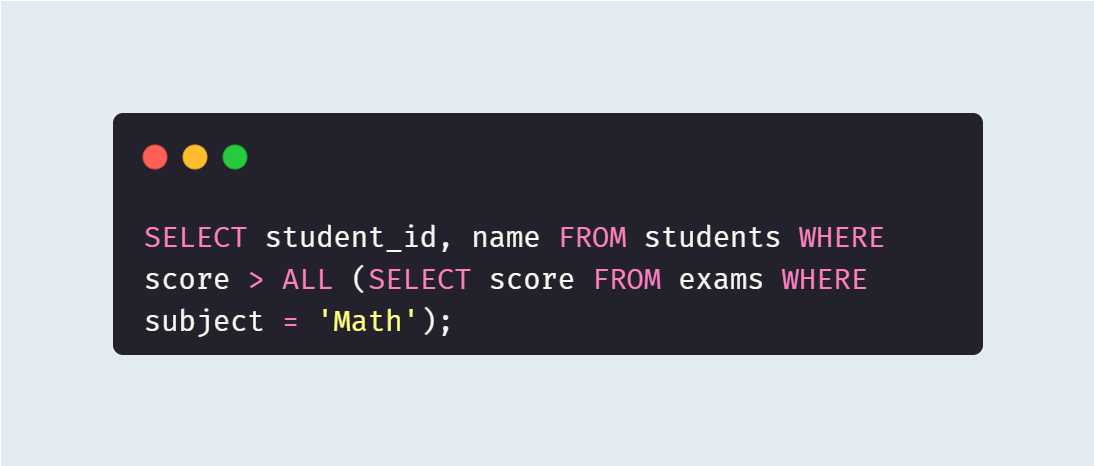 `ALL` 키워드는 주어진 모든 조건과 일치할 때만 참을 반환한다. 이 쿼리는 `Math` 과목의 모든 시험 점수보다 높은 점수를 받은 학생들을 찾는다. 즉, `Math` 시험의 최고 점수보다도 높은 점수를 받은 학생들만 선택된다.