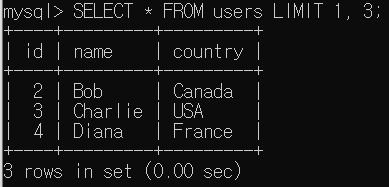 만약 위와 같이 `LIMIT 1, 3`으로 한다면 1개의 행을 건너뛰고 3개의 행을 출력한다.