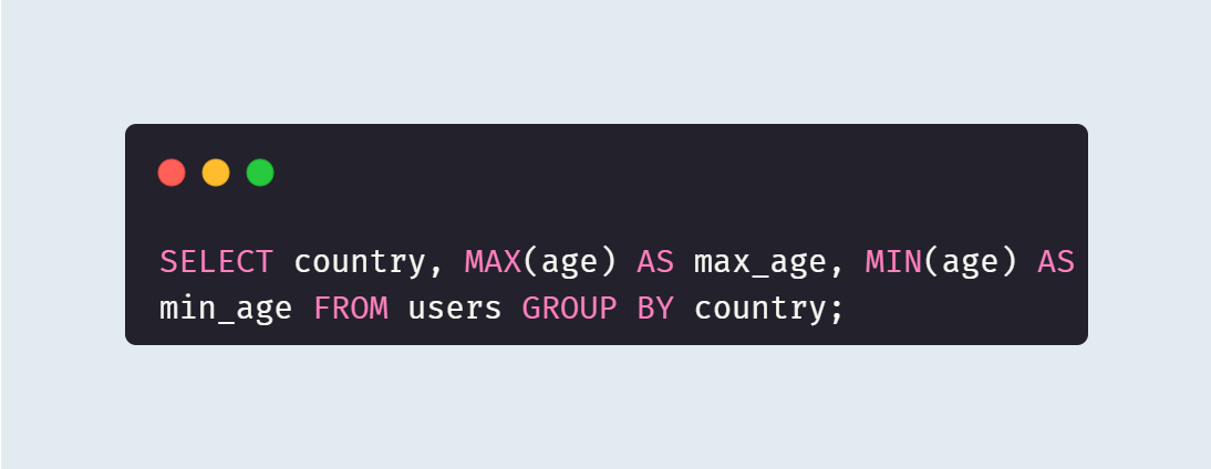 위 쿼리는 국가별로 그룹화하여 각 국가에서의 최대 나이와 최소 나이를 구한다