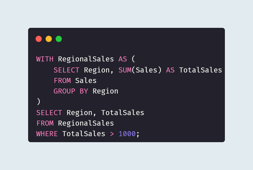이 예시에서 `RegionSales` CTE는 각 지역별 총 판매액을 계산하고, 최종 `SELECT`문은 이 중에서 총 판매액이 1000을 초과하는 지역만을 선택하여 결과를 반환한다.