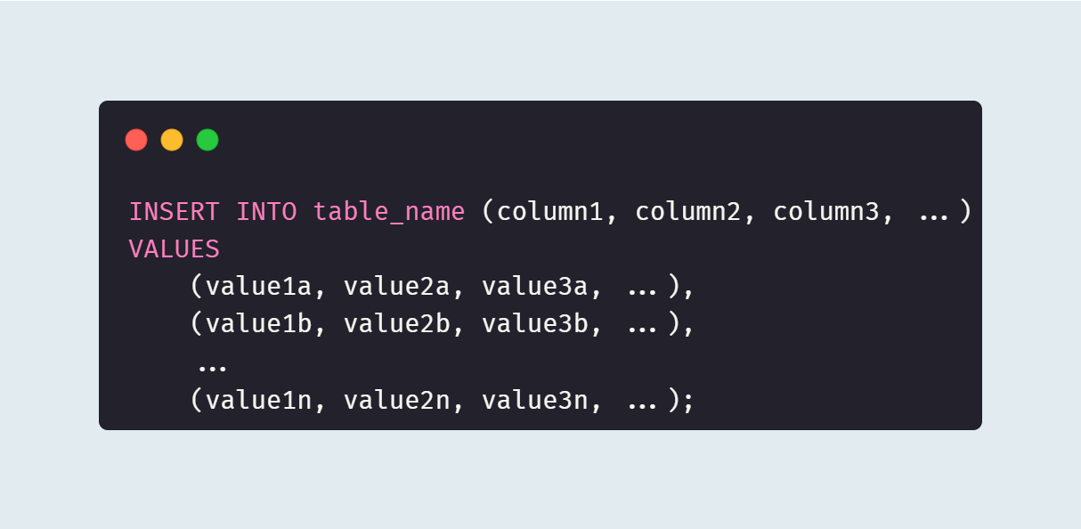 `(column1, column2, column3, ...)`은 데이터를 삽입할 테이블의 열 이름이다. 이 부분은 선택 사항이며, 모든 열에 데이터를 삽입하는 경우 생략할 수 있다.