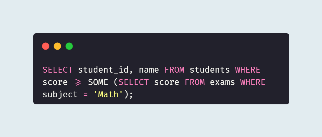 `SOME` 키워드는 `ANY`와 동일하게 작동하며, 서브 쿼리의 결과 중 적어도 하나가 조건과 일치하면 참을 반환한다. 이 쿼리는 `Math`과목 시험 점수 중 하나 이상과 같거나 그보다 높은 점수를 받은 학생들을 찾는다.