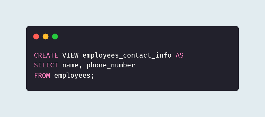 회사의 인사 관리 시스템에서 모든 직원의 상세 정보를 담고 있는 `employee`라는 테이블이 있다고 가정하자. 이 테이블에는 이름, 주소, 전화번호, 급여 등의 개인 정보가 포함되어 있다. HR 부서는 모든 정보에 접근할 수 있어야 하지만, 다른 부서의 직원은 이름과 전화번호만 볼 수 있어야 한다. 이러한 요구 사항을 충족시키기 위해, 이름과 전화번호만 포함하는 뷰를 생성할 수 있다.
