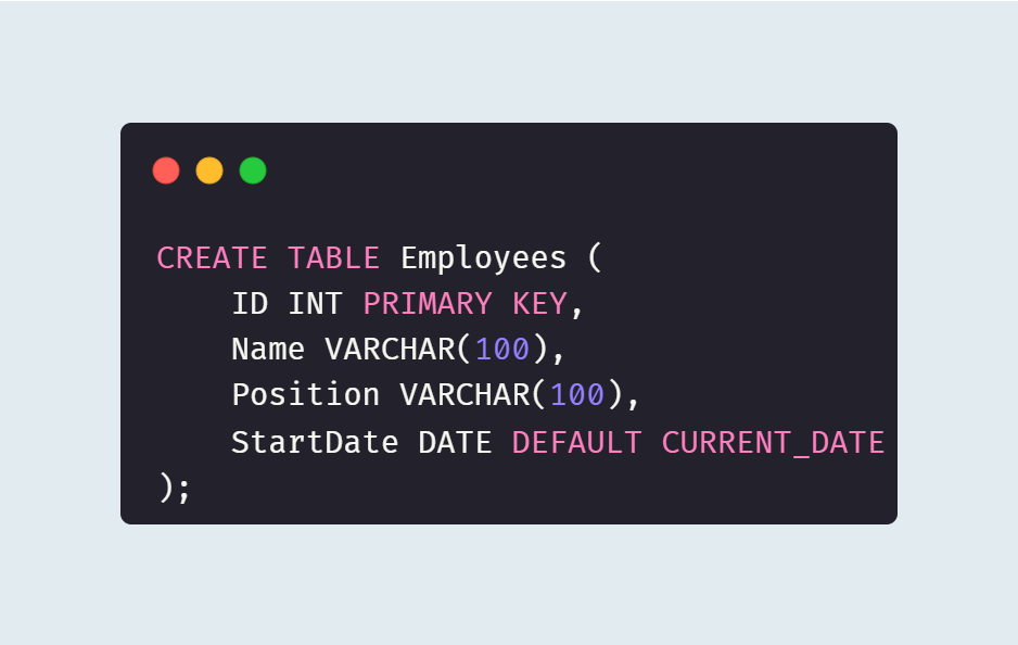 `StartDate` 컬럼은 `DEFAULT` 제약 조건을 사용하여 새 직원 레코드가 생성될 때 날짜 값을 제공하지 않으면 현재 날짜(`CURRENT_DATE`)를 기본값으로 사용한다.