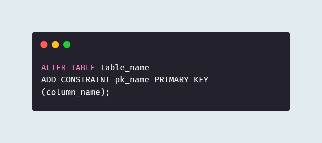 테이블 생성 이후에 기본키를 추가하거나 기존 테이블에 복합 기본키를 설정하고 싶을 때는 `ALTER TABLE`문과 `ADD CONSTRAINT` 구문을 사용할 수 있다.