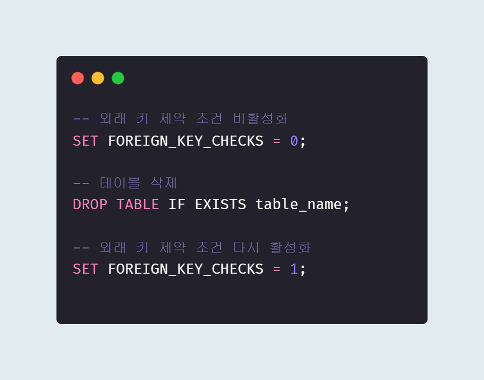 - 외래 키 제약 조건 일시적으로 비활성화: 외래 키 제약 조건을 일시적으로 비활성화하고 테이블을 삭제한 다음, 제약 조건을 다시 활성화할 수 있다.
