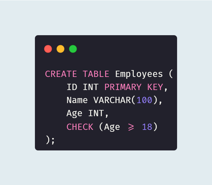 - 데이터 무결성 유지: 테이블에 삽입되거나 업데이트되는 데이터가 사전에 정의된 규칙을 준수하도록 보장한다. 이를 통해 데이터가 즉정 조건을 만족하지 않는 경우 입력을 거부함으로써, 데이터베이스의 무결성을 유지한다