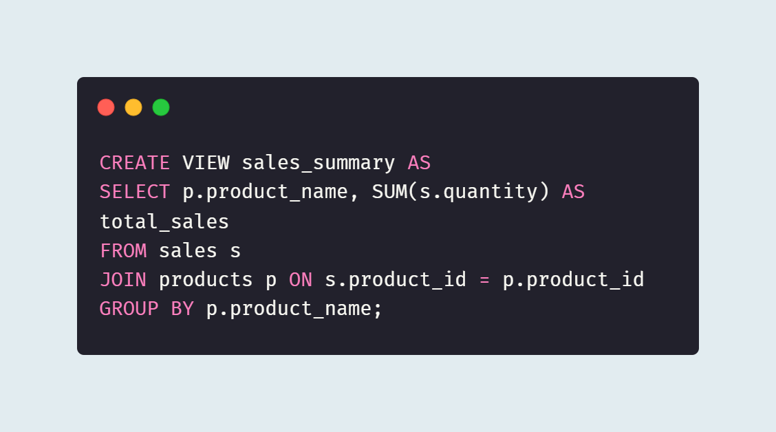 이제 사용자는 `SELECT * FROM sales_summary;`를 실행하기만 하면, 각 제품의 총 판매량을 쉽게 확인할 수 있다.