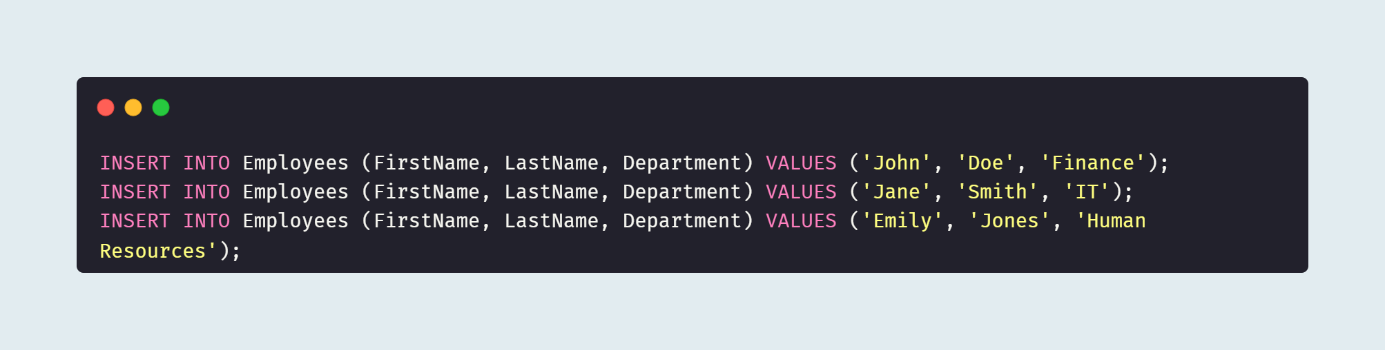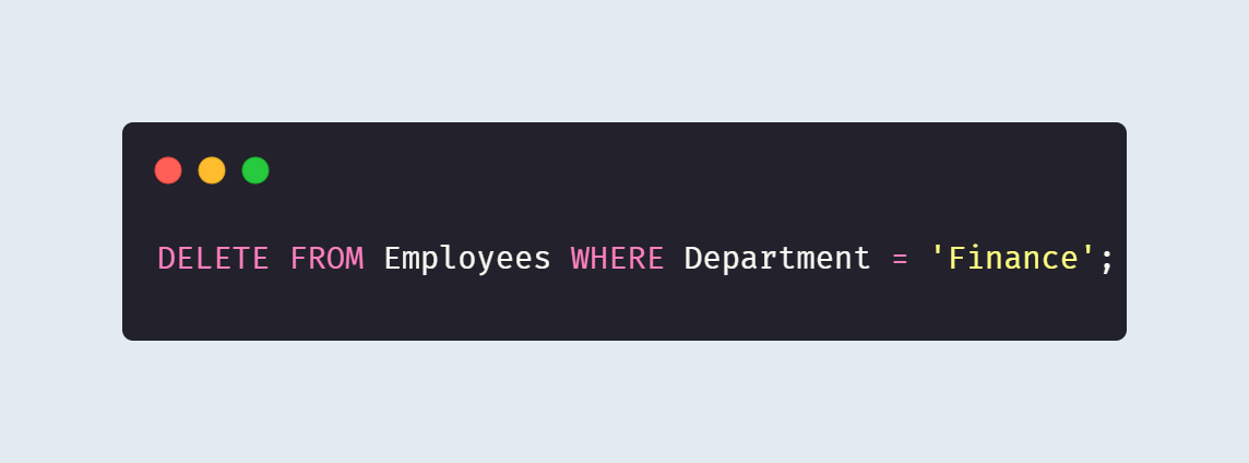`Employee` 테이블에서 특정 조건을 충족하는 데이터를 삭제하는 예시다. 여기서는 `Department`가 `Finance`인 직원을 삭제한다.