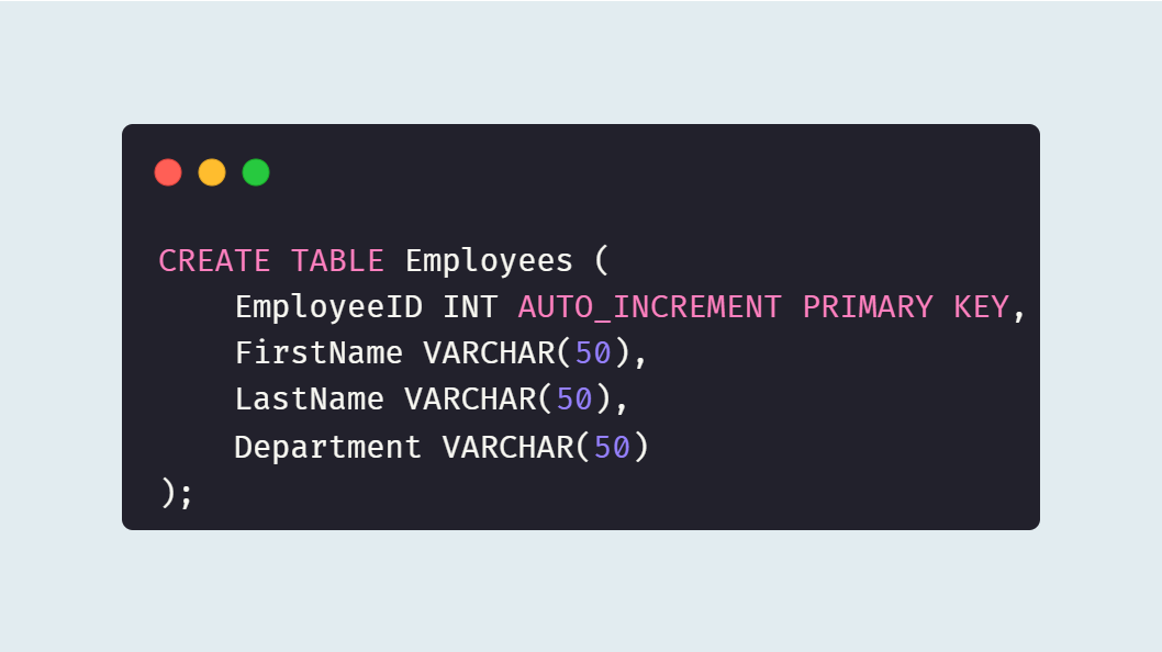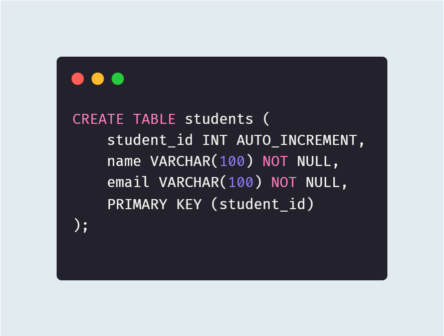 `PRIMARY KEY (student_id)` 구문을 사용하여 `student_id` 컬럼을 기본키로 지정했다. 이는 `student_id`의 값이 각 행마다 고유해야 하며, `NULL` 값을 가질 수 없음을 의미한다.