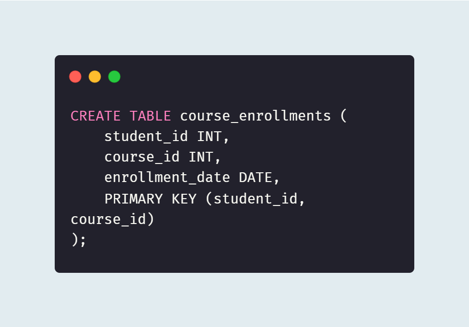 위 예시에서 `PRIMARY KEY (student_id, course_id)` 구문은 `student_id` 와 `course_id`의 조합을 기본키로 지정한다. 즉, 동일한 `student_id`와 `course_id`의 조합을 가진 두 행이 테이블 내에 존재할 수 없다.