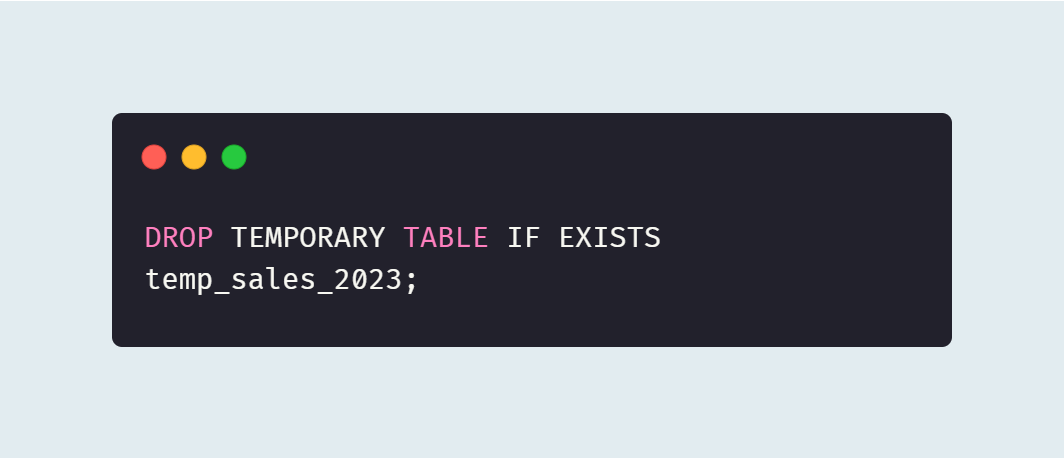 다음과 같은 방식으로 임시 테이블을 삭제할 수 있다. 세션이 종료될 때 자동으로 삭제되기 때문에 명시적으로 삭제하고 싶을 때 선택적으로 사용하면 된다.