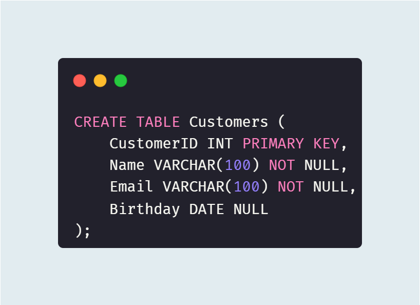 위 예시에서 `Birthday` 필드는 `NULL` 값을 허용하므로, 고객이 생일 정보를 제공하지 않을 경우에도 고객 레코드를 생성할 수 있다. 즉, 유연하게 데이터 입력이 가능하다.