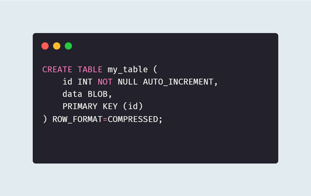위 예시에서 `my_table`은 `COMPRESSED` 로우 포맷을 사용하여 생성된다. `COMPRESSED` 포맷은 테이블의 데이터를 압축하여 저장 공간을 절약하고, 디스크 I/O를 줄이는 데 도움이 된다.