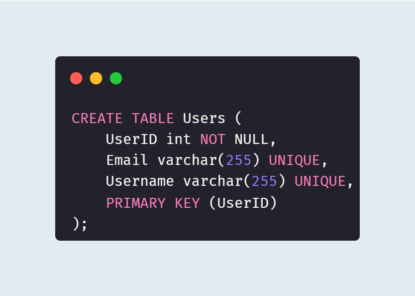 위 예시에서는 `Users` 테이블에 `Email`과 `Username` 컬럼이 `UNIQUE` 제약 조건을 갖는다. 이는 각 사용자의 이메일 주소와 사용자 이름이 테이블 내에서 고유해야 함을 의미한다. 즉, 두 사용자가 동일한 이메일 주소나 사용자 이름을 가질 수 없다.