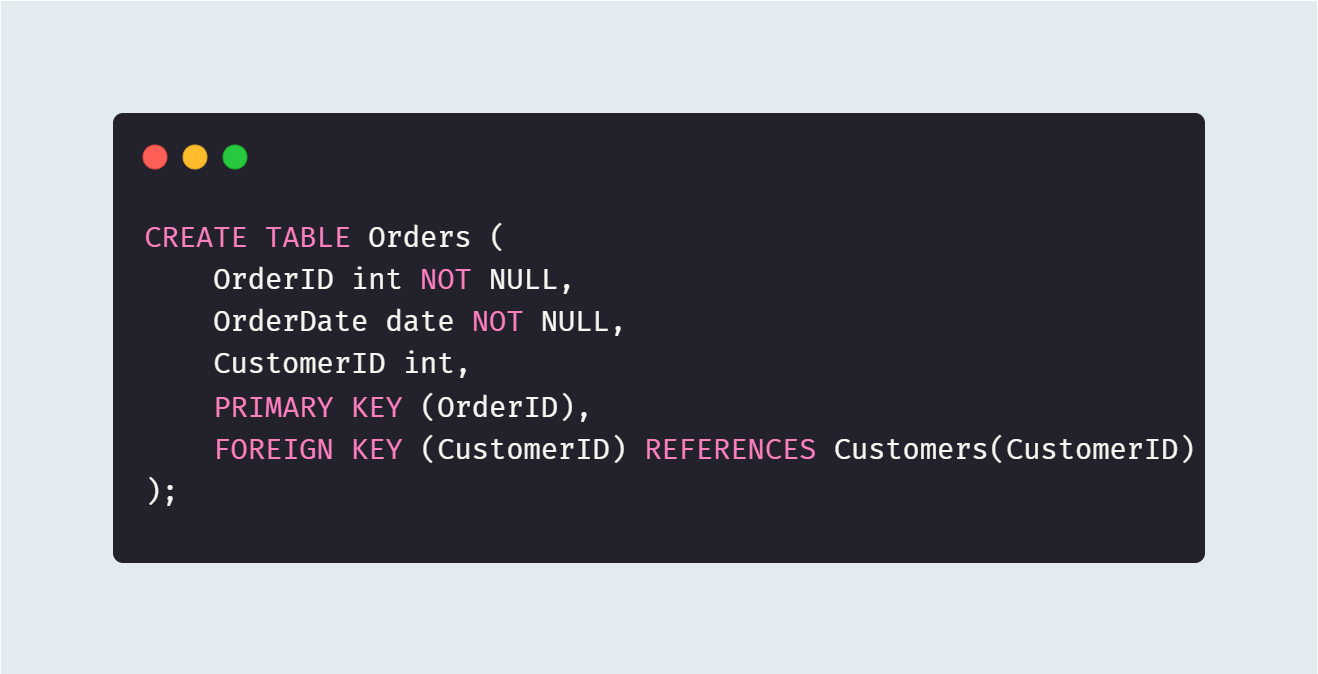 위 예시는 `Orders` 테이블의 `CustomerID` 필드를 `Customers` 테이블의 `CustomerID` 필드에 대한 외래 키로 설정한다. 이를 통해 `Order` 테이블에 삽입되는 각 주문이 유효한 고객 ID를 참조하게 된다.