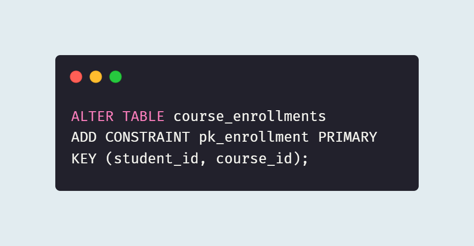 이 명령은 `course_enrollments` 테이블에 `student_id`와 `course_id` 컬럼의 조합으로 구성된 복합 기본키를 추가한다. 여기서 `pk_enrollment`는 이 기본키 제약 조건의 이름으로, 데이터베이스 내에서 해당 제약 조건을 참조할 때 사용된다.