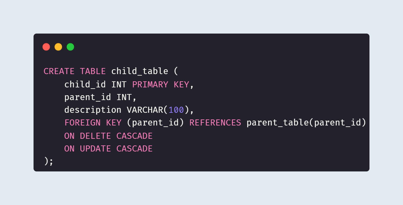 `ON DELETE CASCADE` 옵션은 부모 테이블에서 레코드가 삭제될 때, 해당 레코드를 참조하는 자식 테이블의 모든 레코드도 함께 자동으로 삭제된다. 이는 데이터베이스에서 고나련 데이터를 유지 관리할 때 데이터 일관성을 보장하는 데 유용하다.