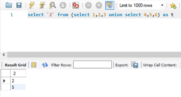 백틱은 식별자를 나타낼 때 사용된다. 즉, 칼럼명을 지정해서 출력할 수 있다. 2번째 열의 칼럼명이 2이므로 `2`를 통해 2번째 열만 출력할 수 있다.