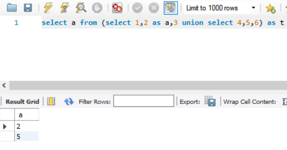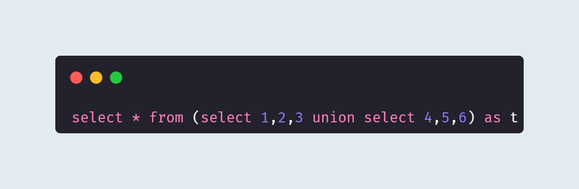 앞 쪽 select 문의 1,2,3이 칼럼명이 되고 1,2,3과 4,5,6의 값이 레코드로 들어간다.