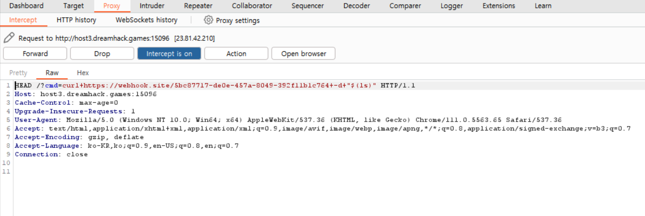 버프스위트로 패킷을 살펴보고 수정할 수 있다. GET으로 구성된 패킷을 HEAD 메소드로 바꾸고 cmd 매개변수의 값을 넣어주자