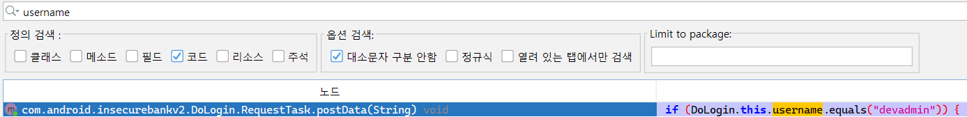 앞서 설명한 검색 방법으로 `username`을 검색하게 되면 `devadmin`이라는 username이 하드코딩되어 사용되는 것을 확인할 수 있다. 더블클릭하여 자세한 내용을 확인해보자.