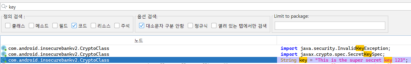 그럼 위와 같은 하드코딩된 키값을 확인할 수 있다. 이런 키 값으로 복호화가 일어날 수 있기 때문에 이런 키 하드코딩은 지양해야한다.