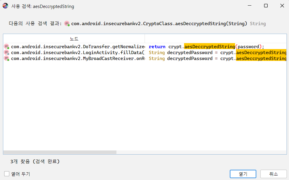 지금 보고있는 변수 혹은 함수가 어디서 사용되는지 보고싶으면 `x`키를 눌러 확인할 수 있다. `aesDeccryptedString`는 앞서 하드코딩된 key의 사용을 추적하면서 확인했다.