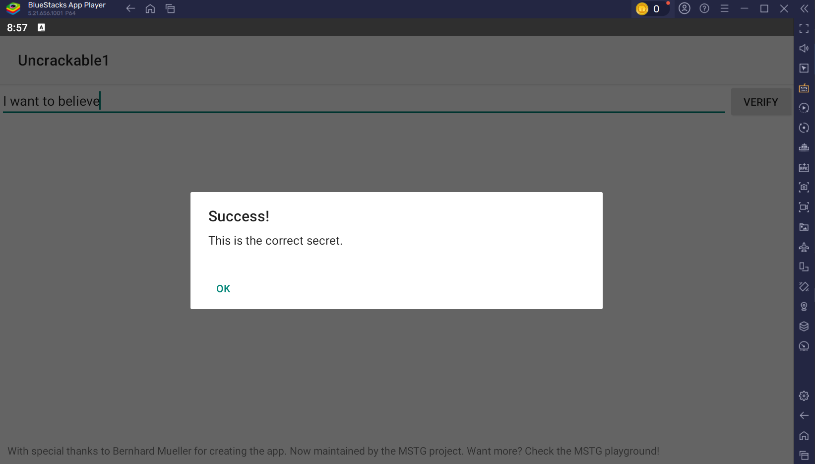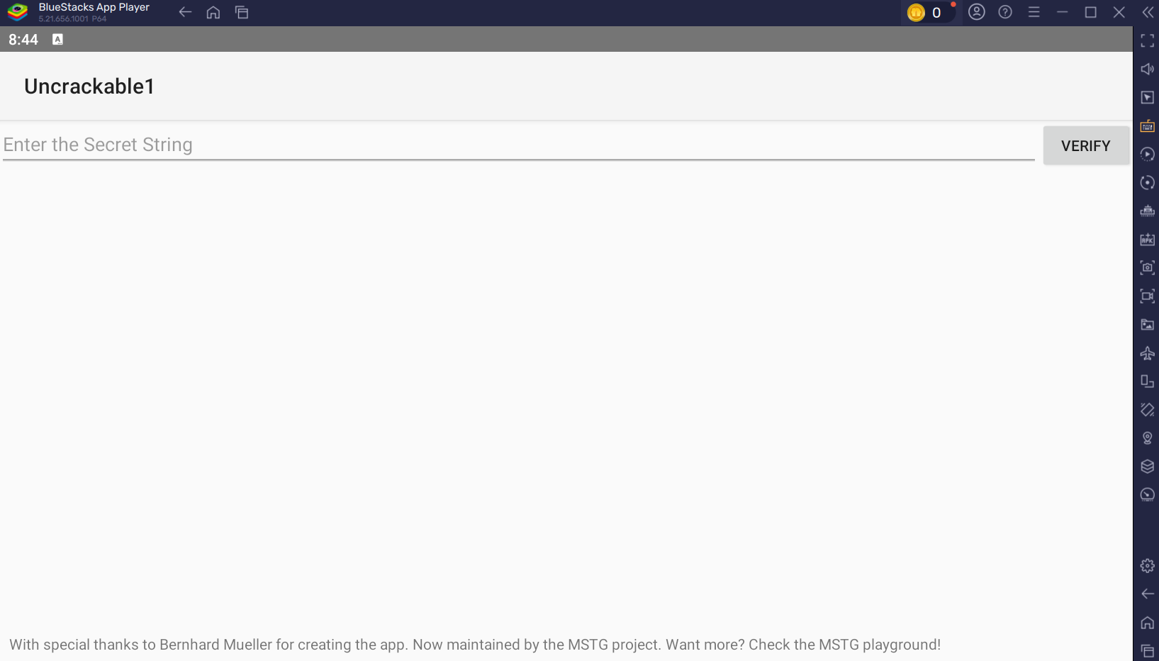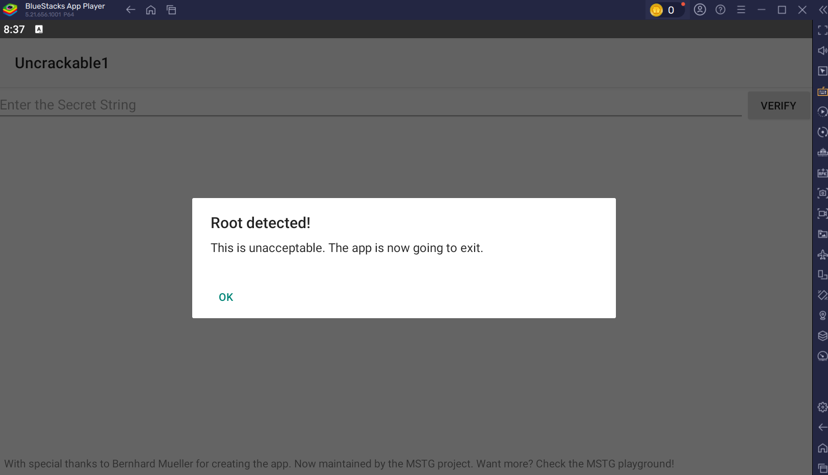 [Android Emulator 5554::owasp.mstg.uncrackable1 ]-> [+] Hooked c.a() - Returning false