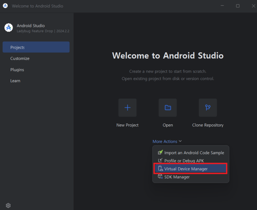 설치 후에 Virtual Device Manager로 AVD에 접근해준다.