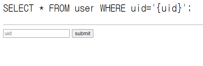 <pre style="font-size:200%">SELECT * FROM user WHERE uid='{uid}';</pre><hr/>