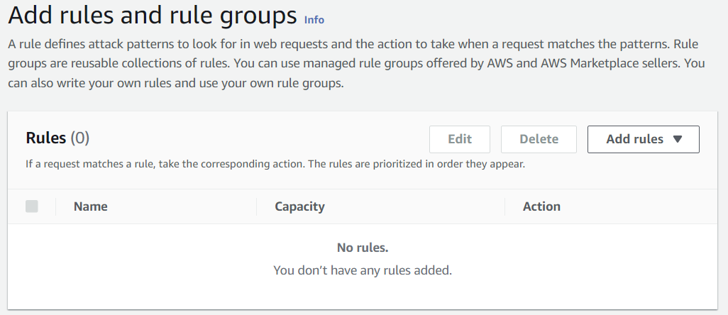 WAF를 설정할 때 어떤 요청을 방어할 것인지 규칙을 세울 수 있다. Add rules를 눌러 규칙을 세우자.