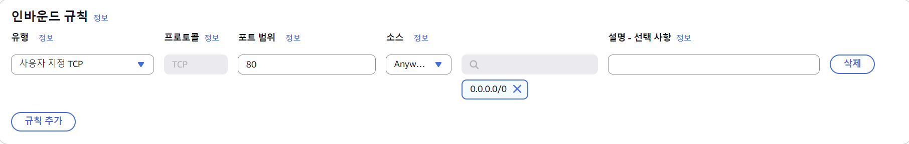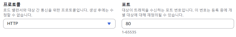 여기서 프로토콜과 포트는 어떤 프로토콜과 어떤 포트로 요청을 받을 것인지를 의미한다. 앞서 보안 그룹 설정과 맞춰서 80포트로 설정하겠다.