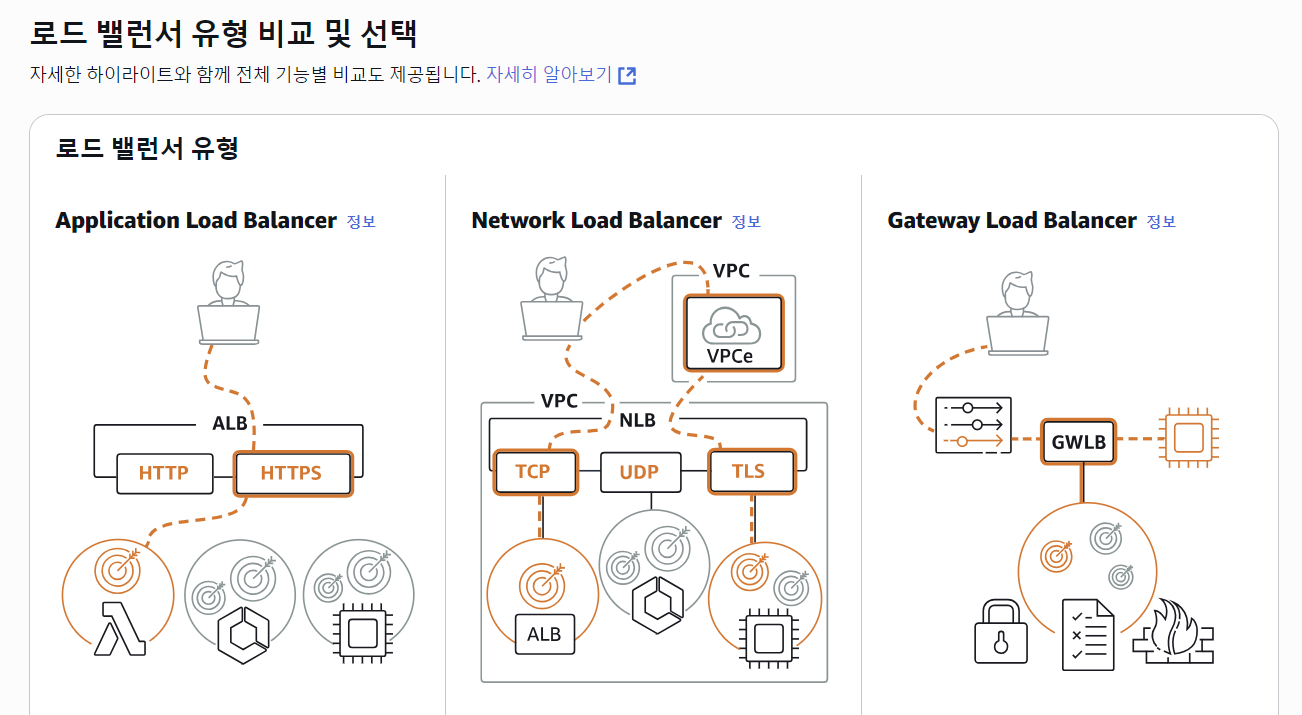 application load balancer를 선택했다. 이번 실습은 waf 설정을 위한 load balancer 구성이기 때문에 각 유형의 차이점은 나중에 공부하겠다.