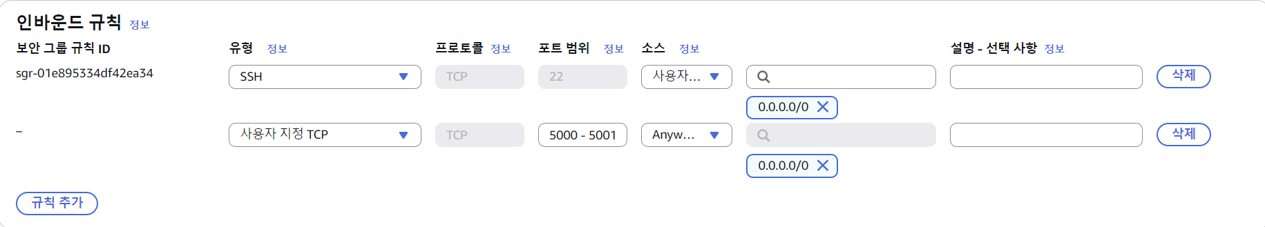 위와 같이 5000번 포트와 5001번 포트에 대해 인바운드 규칙 설정을 해주자.